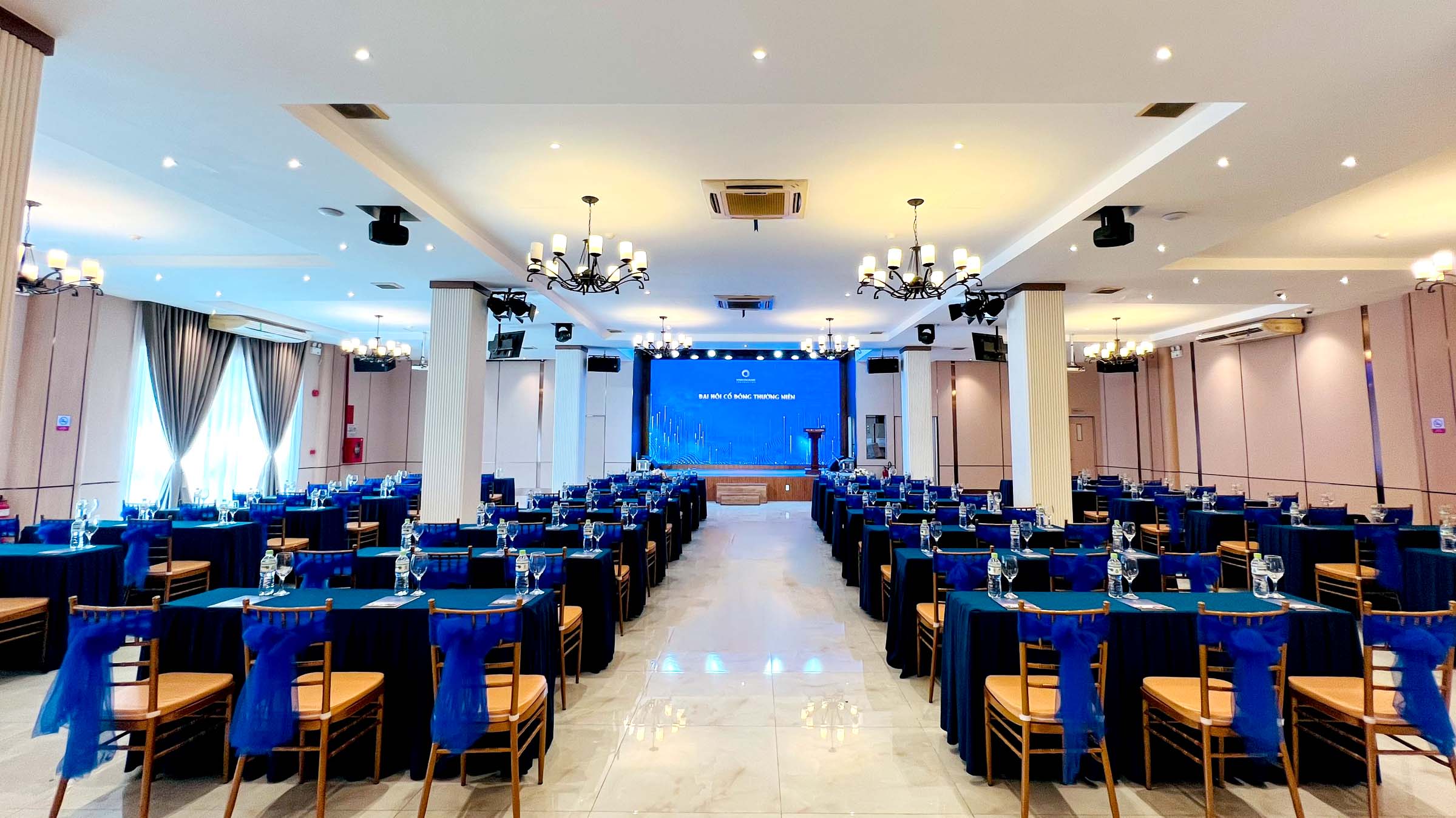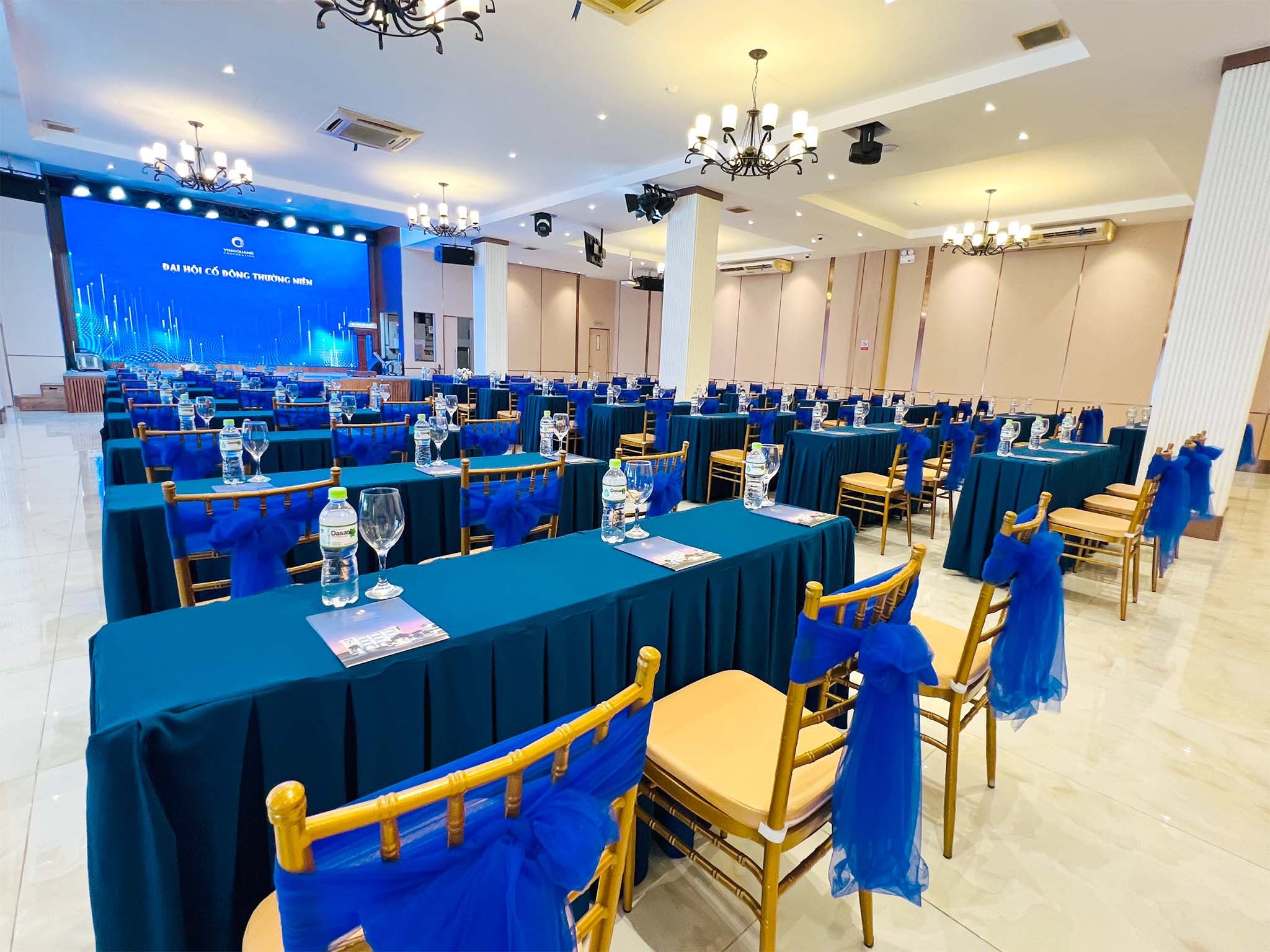 Không gian sảnh sang trọng được trang bị màn hình LED sắc nét, sân khấu rộng lý tưởng cho hội nghị, hội thảo và các sự kiện doanh nghiệp chuyên nghiệp, hiệu quả.